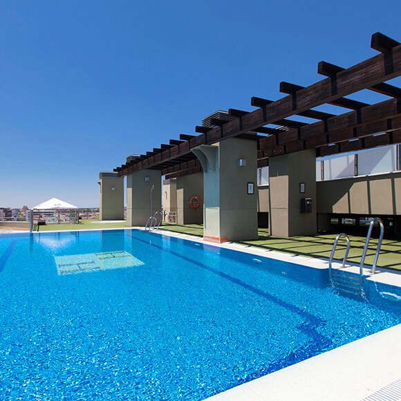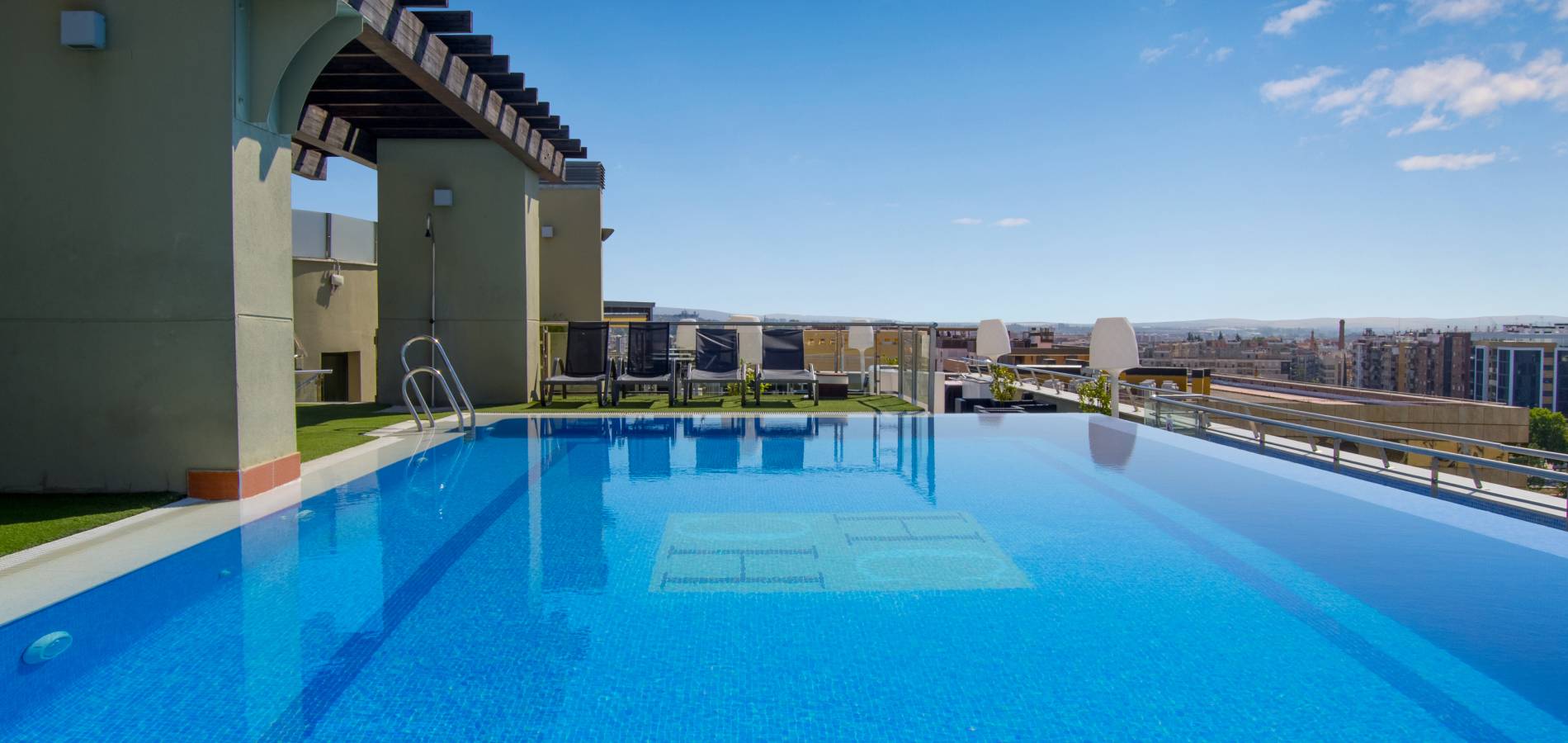 La terrasse de l’hôtel Cordoba Center, située au septième étage, offre une vue panoramique à 360°C sur la ville, la montagne et la campagne de Cordoue. Vous pourrez également profiter de la piscine extérieure panoramique, du jacuzzi à l’air libre et d’un grand solarium avec des chaises longues et des parasols, ainsi que du centre Fitness avec sauna.