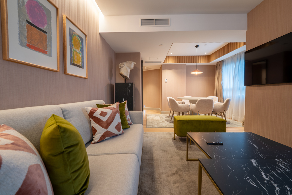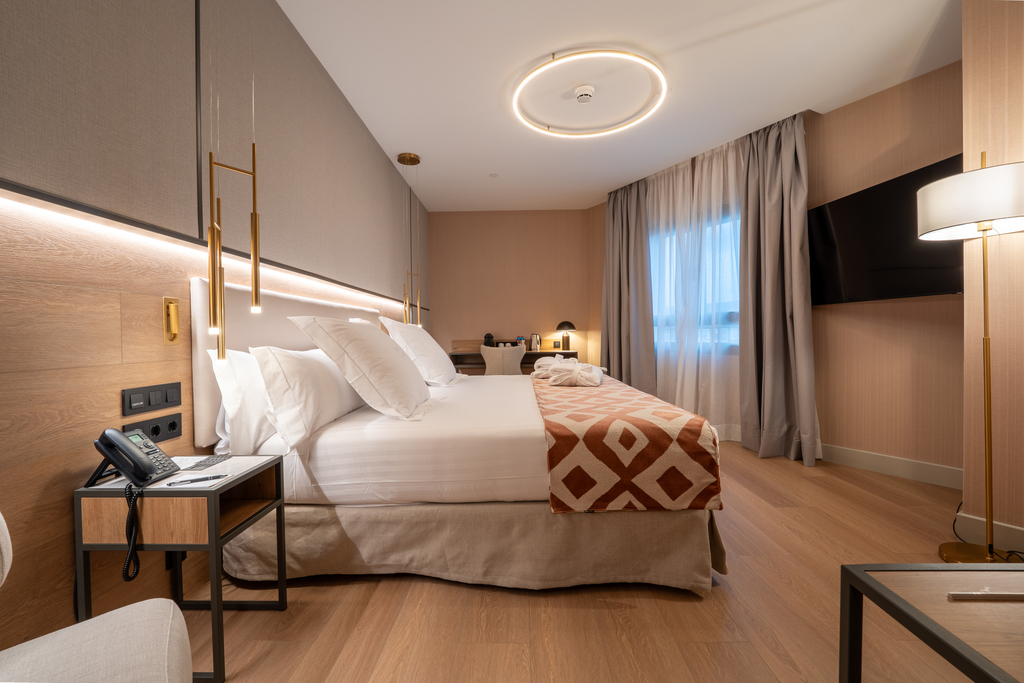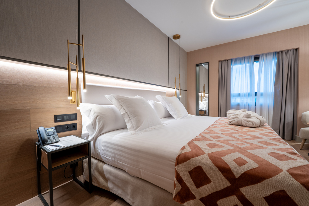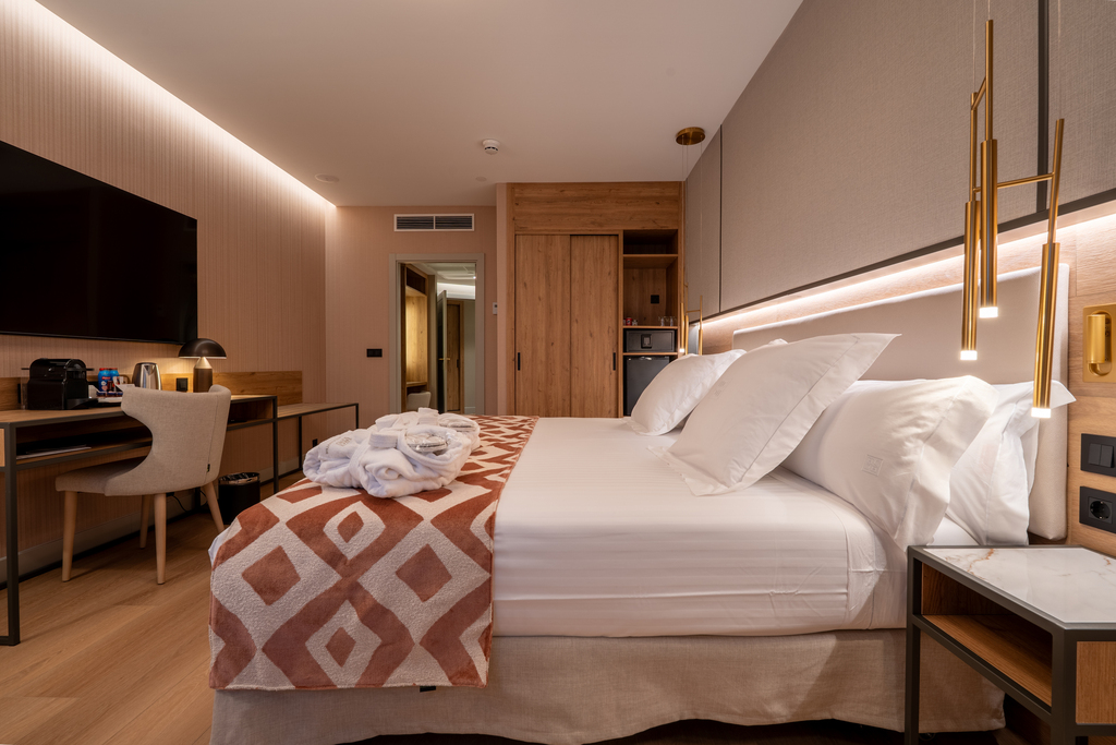 Habitación elegante de estilo clásico dotada de una cama de 2x2m, gran salón, vestidor y recibidor. Baño completo, cafetera/ tetera . Puerta de separación entre entrada y dormitorio.